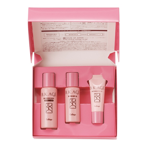 コラージュBKクリーム:トラネキサム酸*、酢酸トコフェロール*、ラウロイルグルタミン酸ジ(フィトステリル・オクチルドデシル)、コメヌカスフィンゴ糖脂質、セラミド2、サクシニルアテロコラーゲン液、ヒアルロン酸ナトリウム(2)、トリメチルグリシン、スクワラン、白色ワセリン、セテアリルアルコール、パルミチン酸セチル、ジメチコン、α-オレフィンオリゴマー、トリエチルヘキサン酸グリセリル、ホホバ油、濃グリセリン、BG、1,2-ヘキサンジオール、自己乳化型ステアリン酸プロピレングリコール、イソステアリン酸POEグリセリル、親油型ステアリン酸グリセリル、ピロ亜硫酸Na、エデト酸塩、無水クエン酸、クエン酸Na、水 *印は「有効成分」、無印は「その他の成分」